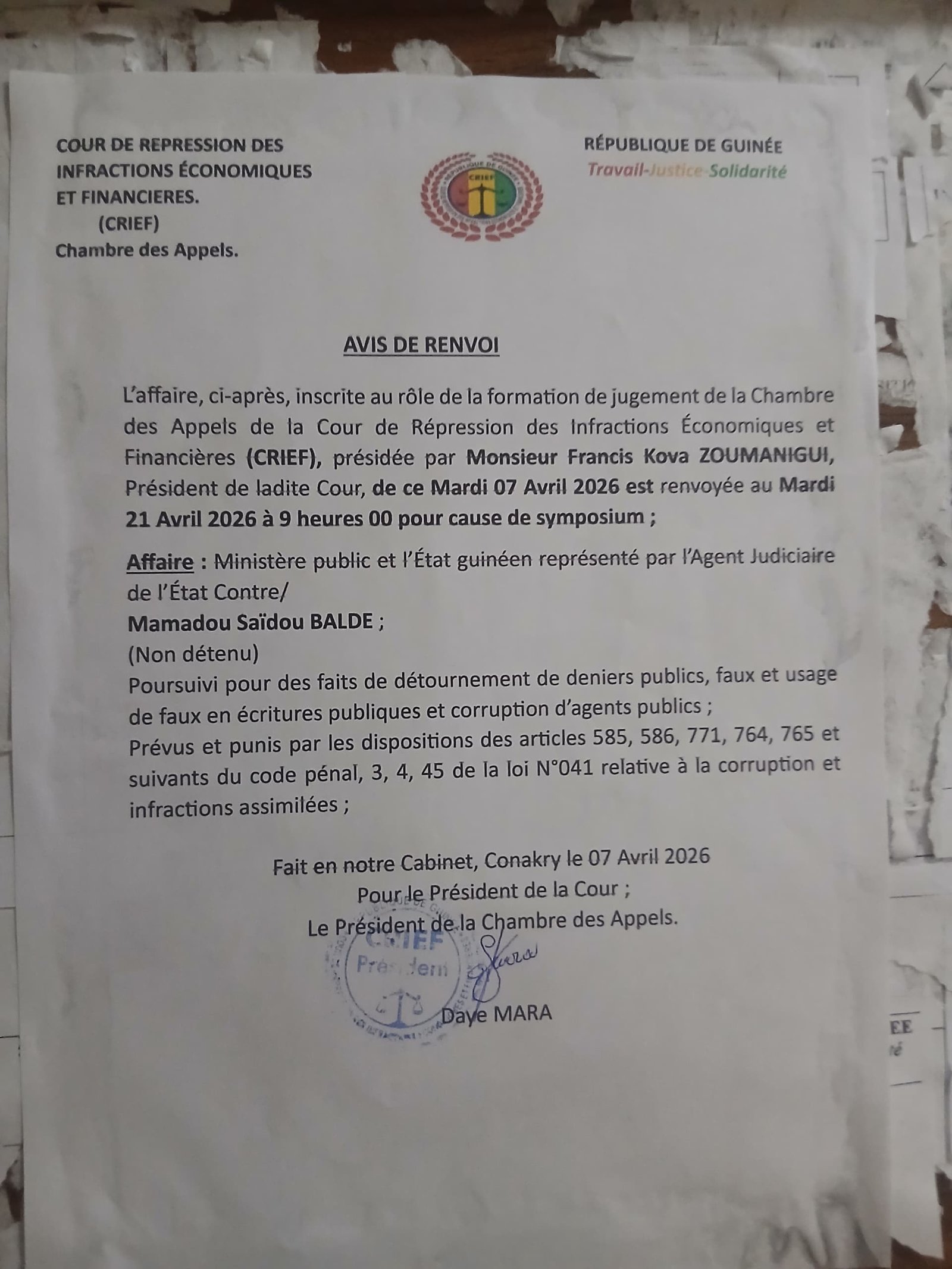 La Chambre des appels de la Cour de Répression des Infractions Économiques et Financières (CRIEF) a décidé du renvoi d’une affaire inscrite à son rôle ce mardi 07 avril 2026. L’audience, initialement prévue à cette date, se tiendra finalement le mardi 21 avril 2026 à partir de 9 heures.