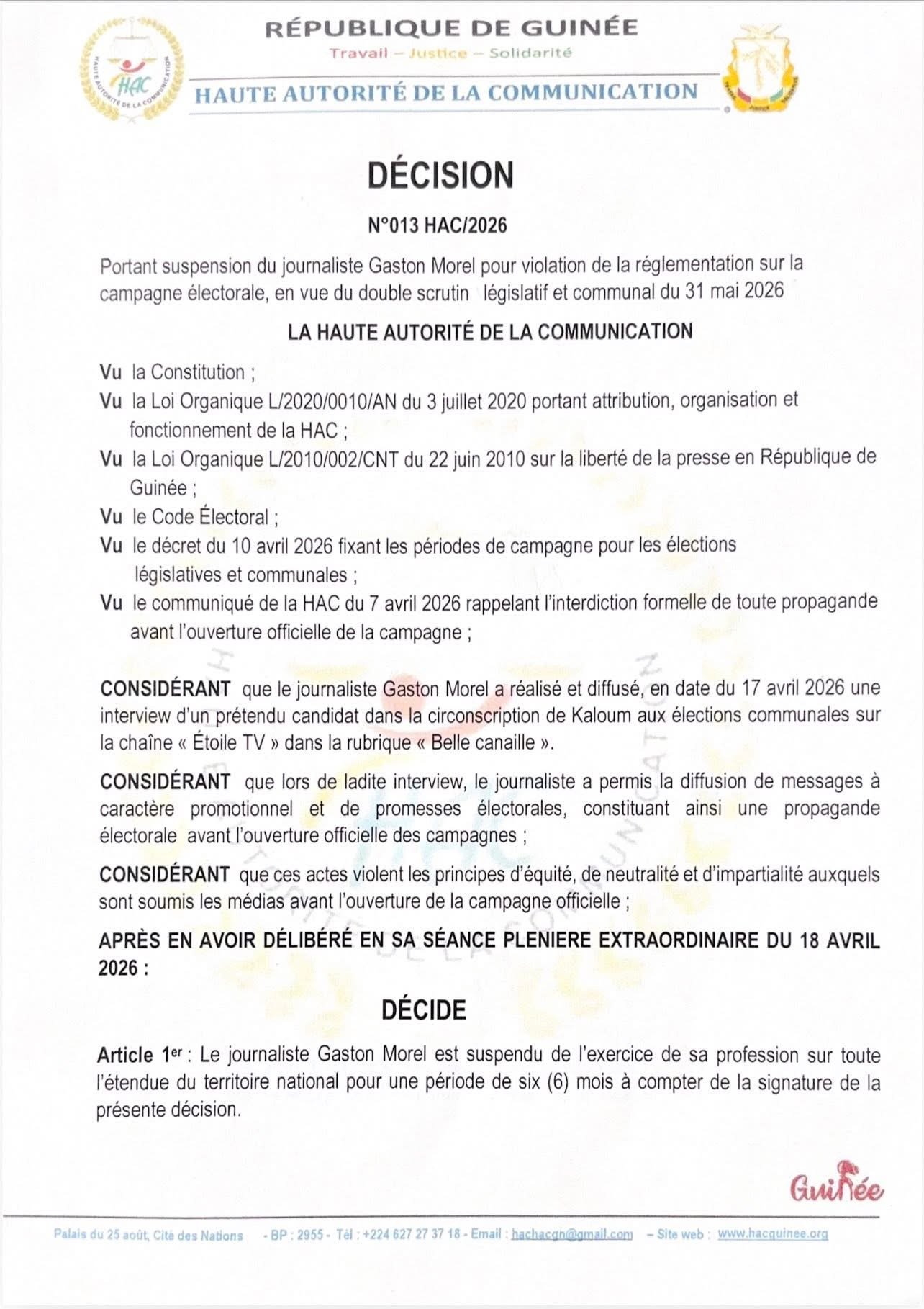 Dans sa décision, l’institution indique que Gaston Morel a réalisé et diffusé, le 17 avril 2026, une interview d’un prétendu candidat à la commune de Kaloum sur la chaîne « Étoile TV », dans l’émission « Belle canaille ». Au cours de cet entretien, des messages à caractère promotionnel ainsi que des promesses électorales auraient été relayés, ce qui constitue, selon la HAC, une forme de propagande anticipée.